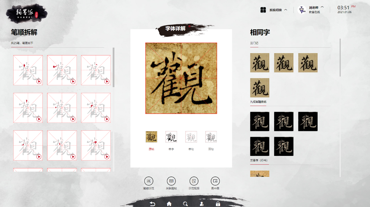 翰墨派云書法教室遵循教育部《中小學書法教育指導綱要》,是集數字化教育技術最新成果之大成,為學校打造新一代互動體驗書法教室。以全息書法碑帖和全息書法字庫為基礎,提供方便的示范及書寫比對工具。即使非專業書法老師也能進行高質量的書法授課,為中小學“書法進課堂”提供便利。