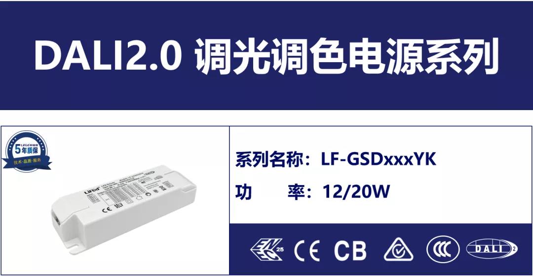 LF-GSDxxxYK 是萊福德為筒燈、射燈、面板燈打造DALI2.0 雙色溫電源,調光深度為0.1%。該款擁有12/20W兩個功率段,體積小巧(12W長寬高:122*40*25mm),筒射燈應用更有優勢。
