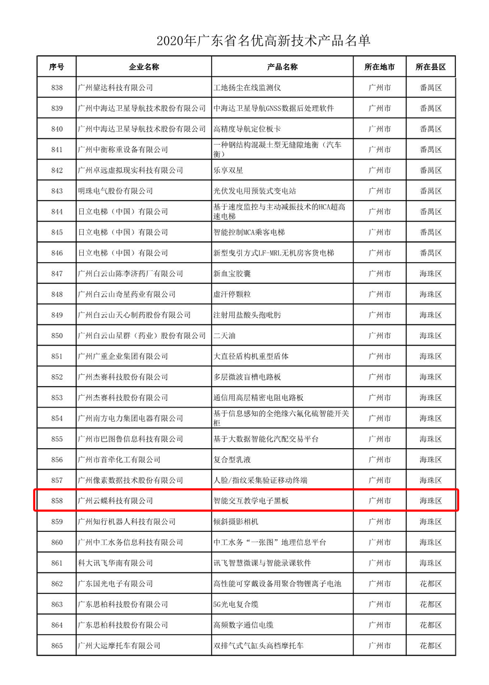 熱烈祝賀云蝶智能交互教學電子黑板入選2020年廣東省名優(yōu)高新技術產(chǎn)品