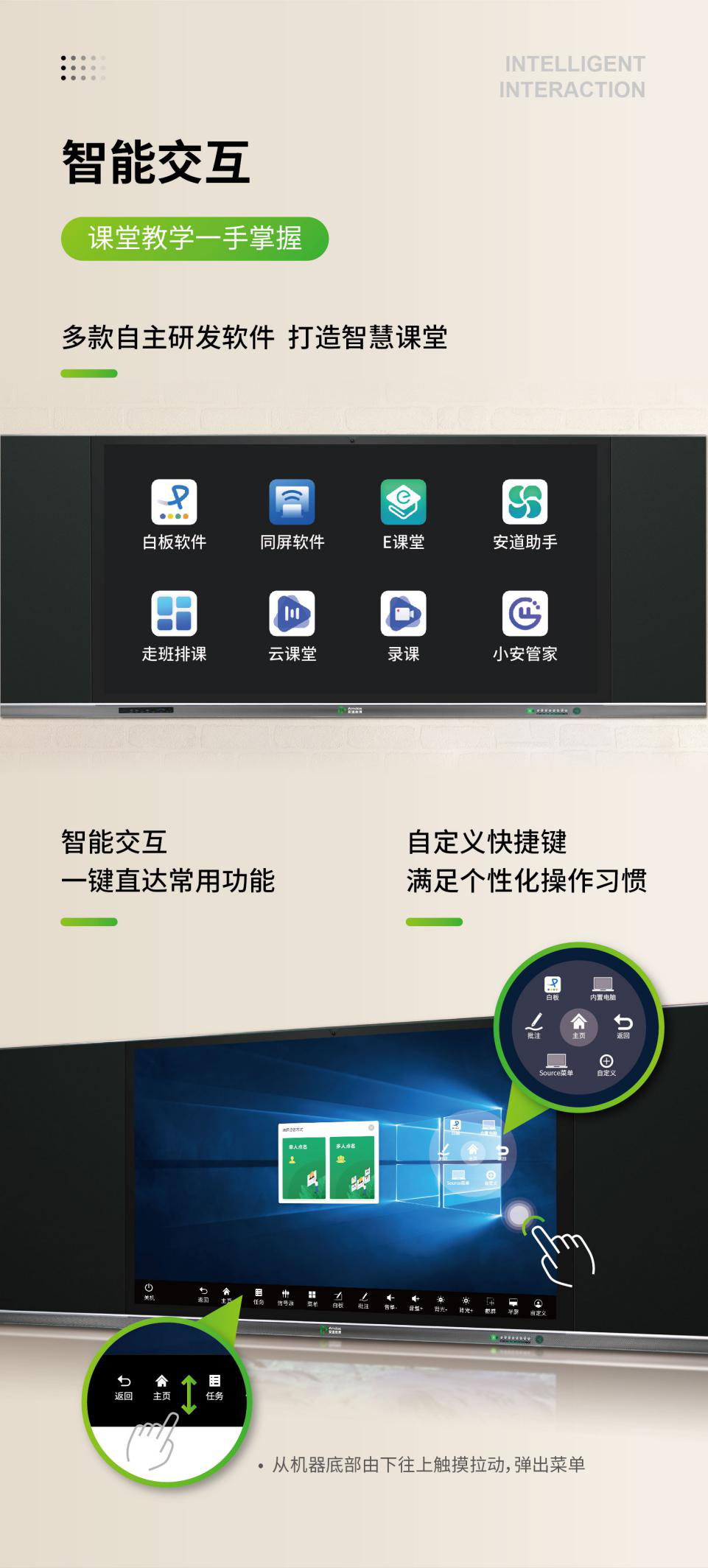 安道智慧大屏黑板高度集成黑板、電視、電腦、平板、音響、投影儀、白板、廣告機等設(shè)備功能,內(nèi)嵌物聯(lián)集控、E課堂、云課堂、白板、同屏等多款安道自主研發(fā)的軟件,通過簡單、人性化的交互,將人與互動教學內(nèi)容有機連接,豐富課程內(nèi)容,打造智慧課堂,為師生營造有趣、高效、高互動的教學環(huán)境,幫助學生加深對知識的記憶和學習。
