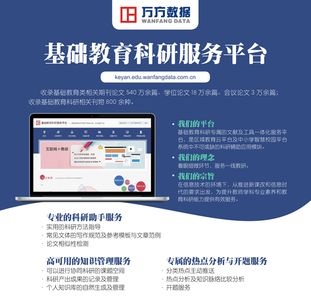 基礎教育科研服務平臺是基礎教育科研專屬的文獻及工具一體化服務平臺。在信息技術環境下,從推進新課改和信息時代的要求出發,助力提升教師學科專業素養和教育科研能力,著眼細微環節,服務一線教研!