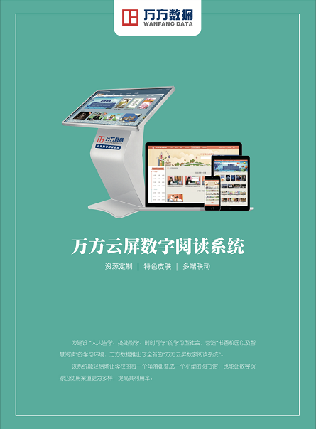 萬方數據云屏數字閱讀系統是一款結合數字資源和觸摸屏一體機硬件設備的資源服務系統,主要滿足中小學校園、公共圖書館等機構的數字資源及文化活動展示等應用需求。