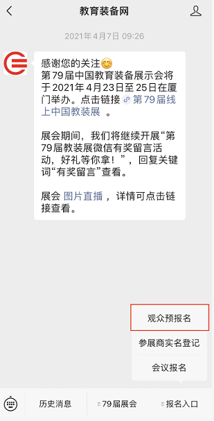 在教育裝備網微信公眾號內,點擊“報名入口”-“觀眾預報名”,填寫信息并提交即可。