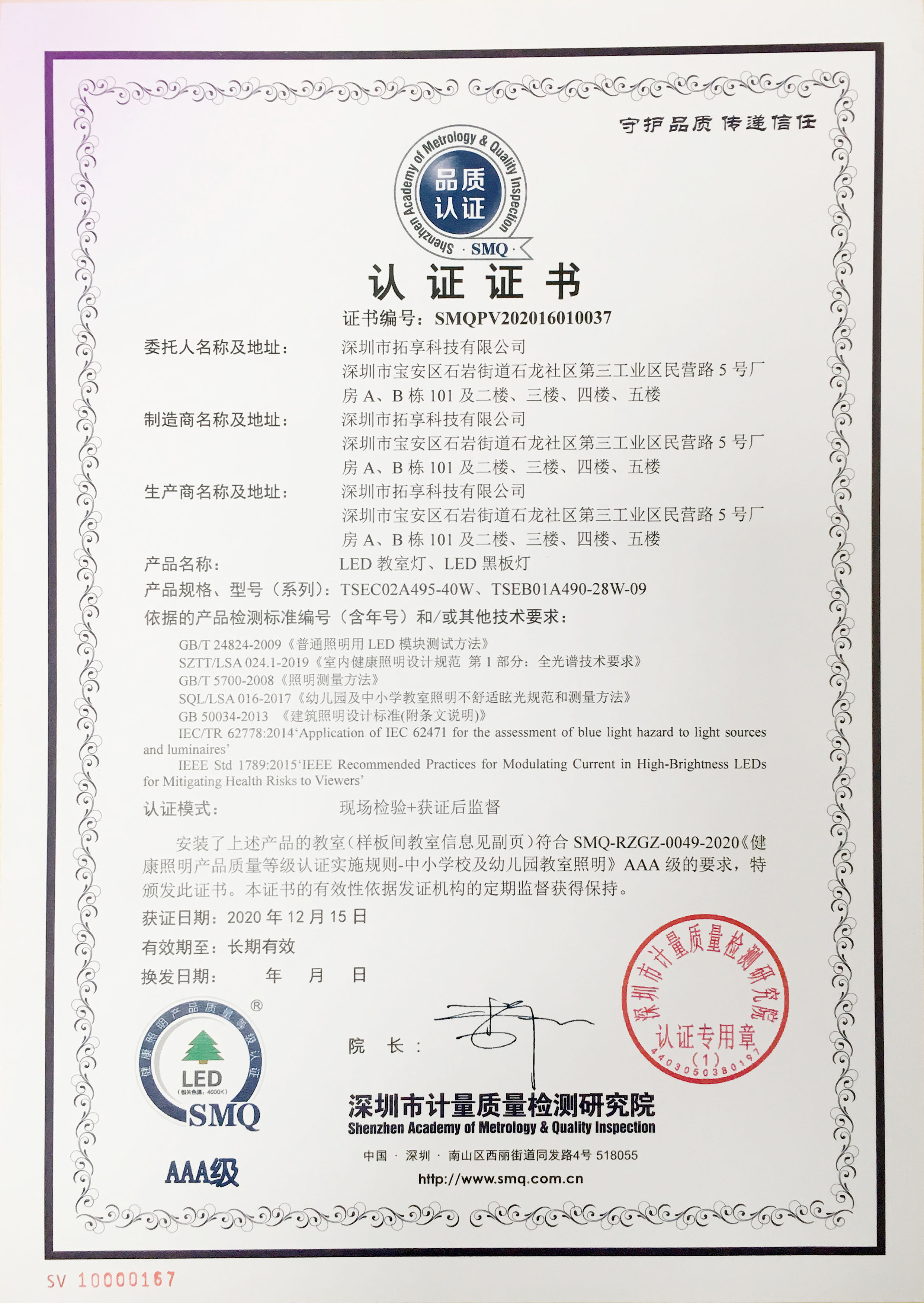 相較于其他方案,全光譜方案更貼合人體的生理節律,可以主動適應人體的需要。全光譜燈具更少的短波高能藍光,可減少對視力傷害。超高的顯色指數,也讓教室空間的色彩呈現更豐富、艷麗。經過大半年的探索與深度研發,拓享睿視明在全光譜健康照明領域再次邁進, 獲得深圳計量質量檢測研究院第一張AAA級全光譜健康光環境認證。
