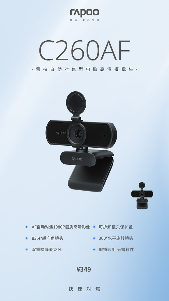 近日,領軍國產外設品牌,實力大廠上市企業Rapoo雷柏,推出了首款帶有AF自動對焦型的電腦高清攝像頭——C260AF,AF自動對焦1080P畫質的高清影像,83.4°超廣角鏡頭,雙重的降噪麥克風,可拆卸的攝像頭隱私保護蓋,360°水平旋轉鏡頭等,為你開啟視頻互動的高清狂潮。