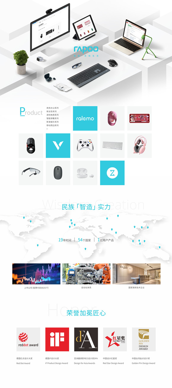 雷柏連年受邀參加德國IFA、美國CES等全球消費電子大展,展現新國貨魅力。屢獲德國IF設計獎、德國Reddot紅點設計大獎、日本G-Mark設計獎、亞洲DFA最具影響力設計獎、中國創新設計紅星獎、中國臺灣金點設計獎等國內外權威設計獎,讓3C硬件重塑新動力與新方向,重構想象。向世人展現新國貨的標桿實力。