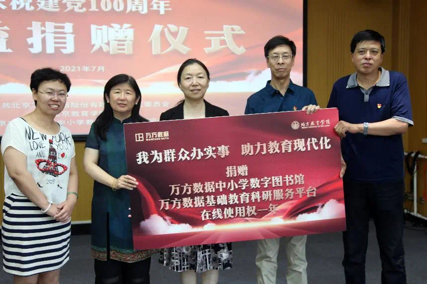 作為中國現代化教育事業闊步前進的參與者之一,7月6日下午,中共北京萬方數據股份有限公司總支委員會聯合中共北京教育學院委員會、北京市教育學會中小學教育文獻信息研究分會共同舉辦的慶祝建黨100周年公益捐贈儀式,在北京教育學院成功舉辦。本次捐贈的產品為萬方數據中小學數字圖書館和基礎教育科研服務平臺,共有30余所北京市延慶區、房山區等地的中小學校和教研中心獲得捐贈,可以免費在線使用上述產品一年。后續,公益捐贈儀式還將在北京市房山區坨里中學(北京教育學院房山實驗學校)舉行。