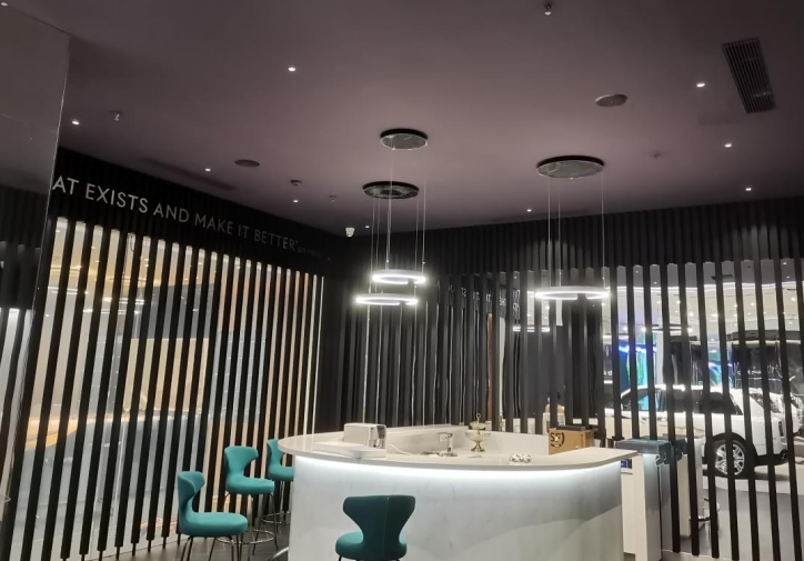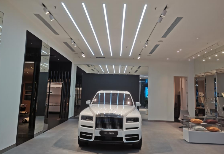 展廳中筒燈、條形燈及造型燈使用萊福德智能控制電源配合快思聰DALI主機(jī),對每一盞燈色溫、亮度精準(zhǔn)調(diào)節(jié),完美詮釋勞斯萊斯不同系列不同風(fēng)格——線條冷光凸顯科技十足“顛覆想象,風(fēng)采耀世”的銀白幻影,筒燈暖光領(lǐng)略庫里南SUV“萬境皆從容,悠然天地間”的豪情肆意……