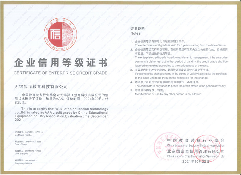 近日,2021年教育裝備行業(yè)企業(yè)信用等級評價結(jié)果出爐,羿飛教育獲得AAA信用等級。