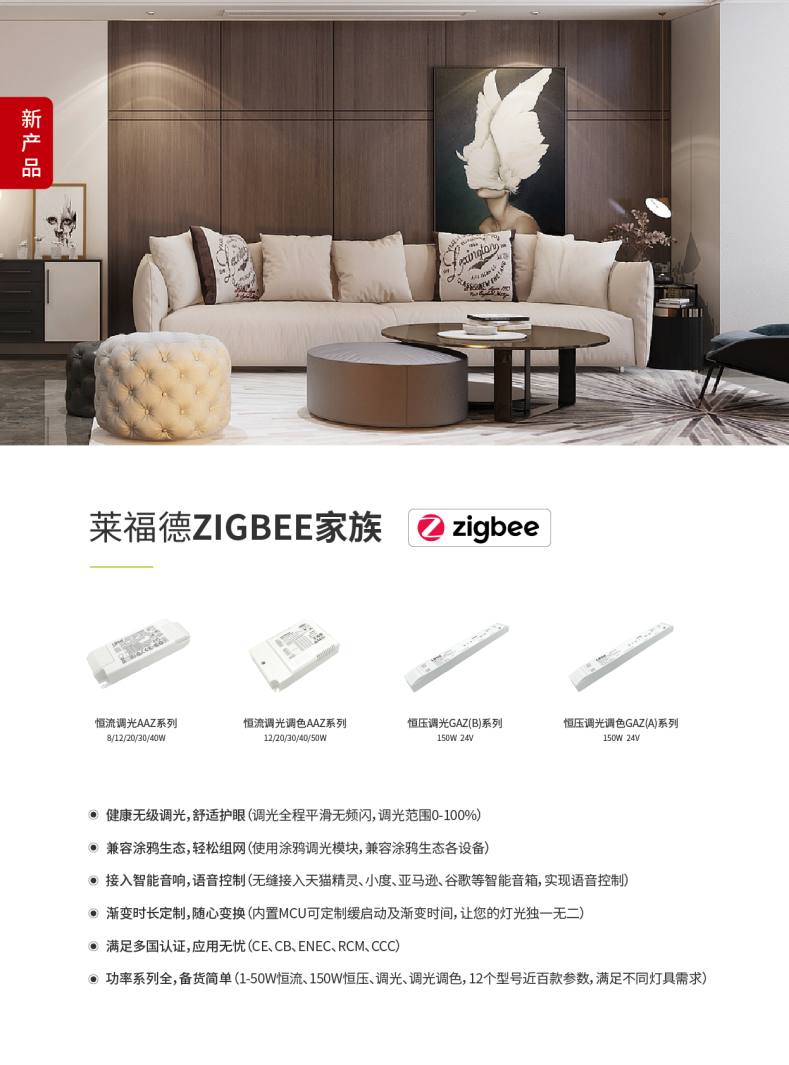 萊福德Zigbee家族除智慧教室專用系列,還有可滿足辦公、商照、家居、燈箱亮化等各領域需求的AAZ調光系列(8-40W)、ABZ雙色溫系列(12-50W)、GAZ恒壓單調光及雙色溫150W系列。