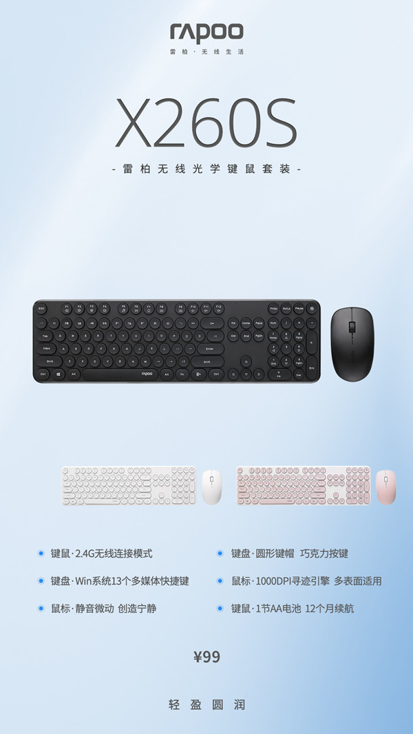 在這個辦公桌面上充斥著各種現代科技風格鍵鼠的時代,X260S帶來了一個不一樣的答案,一種關于生活、關于質感的遐想。亮邊光澤、復古圓形鍵帽、恰到好處的鼠標弧線。在2.4G無線連接模式下,操控更加清澈而安寧。13個Win系統多媒體快捷鍵,1000DPI多表面適用。當現代與復古撞了個滿懷,不如來個完美的邂逅。雷柏X260S無線光學鍵鼠套裝,官方指導價99元,現上市!