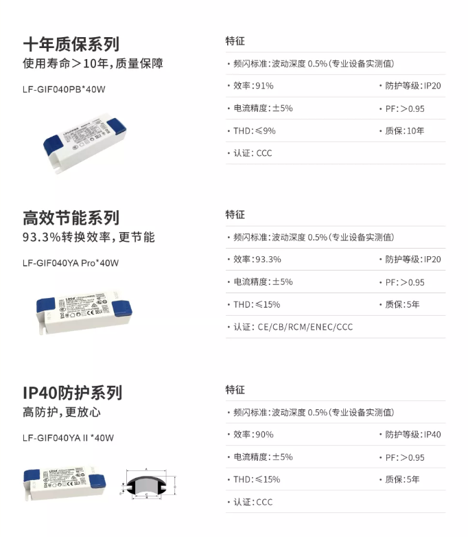 ·恒流AAB調(diào)光&ABB雙色溫、恒壓GAB調(diào)光(B)&調(diào)光調(diào)色(A)電源:四大類別12個型號近百款標(biāo)準(zhǔn)參數(shù),可滿足不同燈具需求