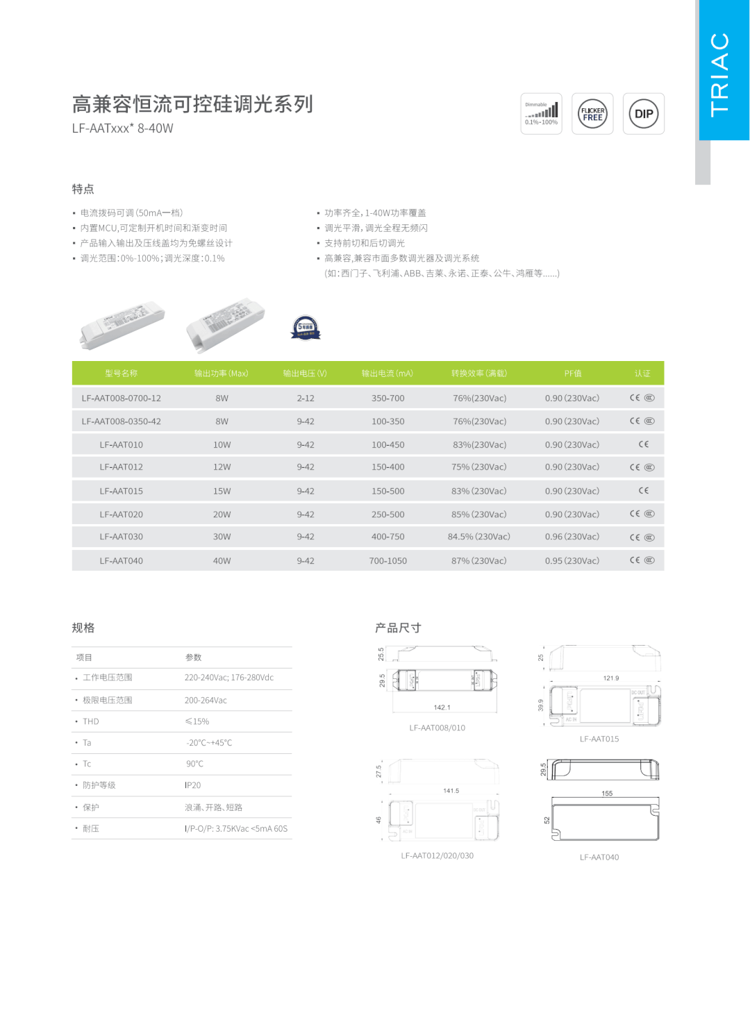 ·AAT恒流調(diào)光電源:兼顧體積、認(rèn)證與性能,內(nèi)置MCU具有超高兼容性,兼容市面主流調(diào)光系統(tǒng),小眾調(diào)光系統(tǒng)也可通過測試調(diào)整曲線實現(xiàn)兼容。