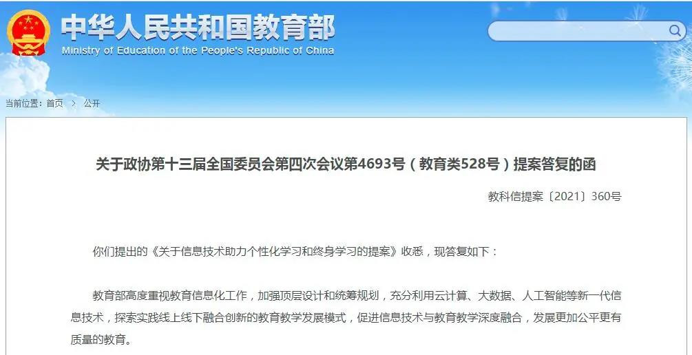 日前,針對(duì)政協(xié)第十三屆全國(guó)委員會(huì)第四次會(huì)議第4693號(hào)(教育類(lèi)528號(hào))提出的《關(guān)于信息技術(shù)助力個(gè)性化學(xué)習(xí)和終身學(xué)習(xí)的提案》,教育部網(wǎng)站公布其答復(fù)情況。