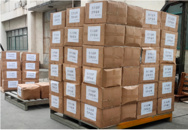 2022年3月22日,上海東方教具緊急調運捐贈物資,包括口罩320000只、防護服600套、洗手液50箱、礦泉水200箱、方便面100箱等。