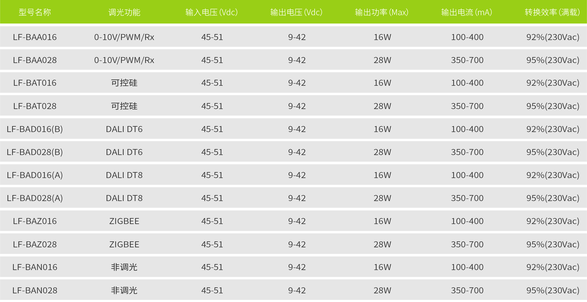各系列擁有16/28W兩款型號(功率范圍5-28W),輸出電壓9-42V,輸出電流覆蓋100-400mA / 350-700mA,且電流50mA一檔撥碼可調(diào),讓產(chǎn)品備貨更方便。