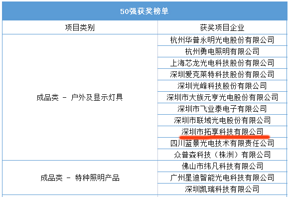 此次入選50強榜單,既是業(yè)界對拓享科技獨具特色的成品類LED燈具產(chǎn)品的認可,也是對公司研銷方面實力的肯定,更是對公司深度探索LED照明產(chǎn)品應用領域、促進公司產(chǎn)品轉型升級的有力推動。值得一提的是,此前,拓享LED健康教室燈(智能款)也入選了本屆阿拉丁神燈獎辦公和教室照明產(chǎn)品類目優(yōu)秀獎。