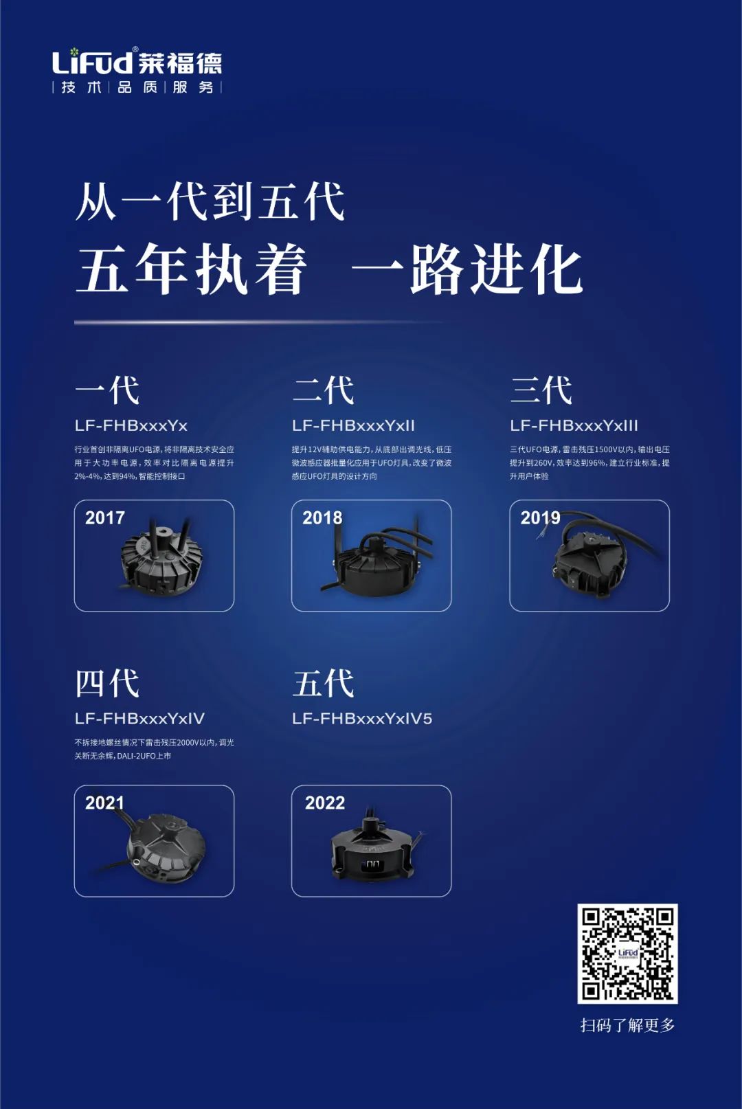 從打破隔離方案,首次開拓非隔離大功率UFO市場推出UFO一代,引領行業進入非隔離UFO時代,到此次光亞展萊福德UFO 5代首次亮相,該款行業首創的集成調色溫、調功率、調電流“三調”功能非隔離UFO電源,再次引來行業眾多客戶圍觀。