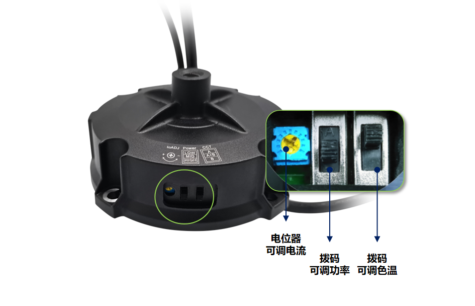 首創三調,三檔功率&色溫撥碼可調,并可通過電位器對三檔功率進一步精確微調實現一款型號多種應用,降低庫存備貨壓力。