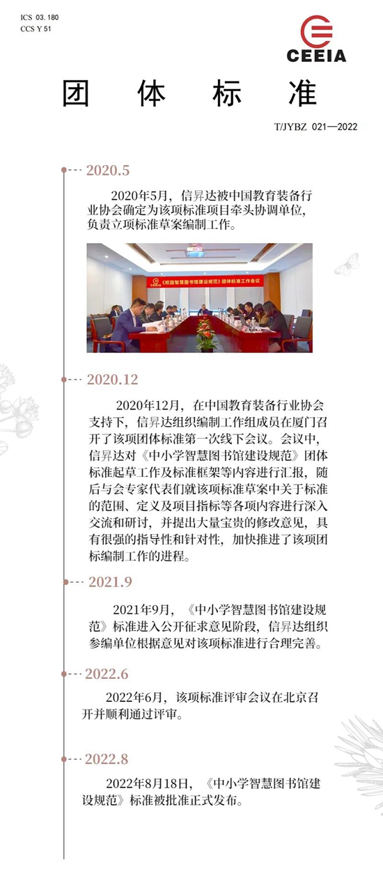 根據(jù)中國教育裝備行業(yè)協(xié)會2022年8月18日發(fā)布的《中國教育裝備行業(yè)團體標(biāo)準公告2022年第1號》公告顯示,由中國教育裝備行業(yè)協(xié)會歸口管理、福建信昇達智能科技有限公司牽頭起草的團體標(biāo)準T/ZYBJ 021-2022《中小學(xué)智慧圖書館建設(shè)規(guī)范》(以下簡稱標(biāo)準)被批準正式發(fā)布。