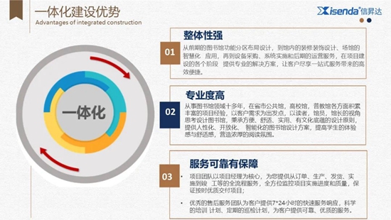 信昇達以實現(xiàn)圖書館館藏借閱研休為目的,以校園文化底蘊為設(shè)計思路,在校園圖書館的整體規(guī)劃、設(shè)計裝修、系統(tǒng)建設(shè)、運營管理等各個階段提供整體解決方案,盡享一站式服務(wù)帶來的高效便捷;一體化建設(shè)不僅能夠滿足中小學(xué)圖書館達標(biāo)建設(shè),更能打造一座體現(xiàn)學(xué)校辦學(xué)理念、展現(xiàn)校園文化特色的現(xiàn)代化、智能化校園圖書館,推動師生閱讀,共建書香校園。
