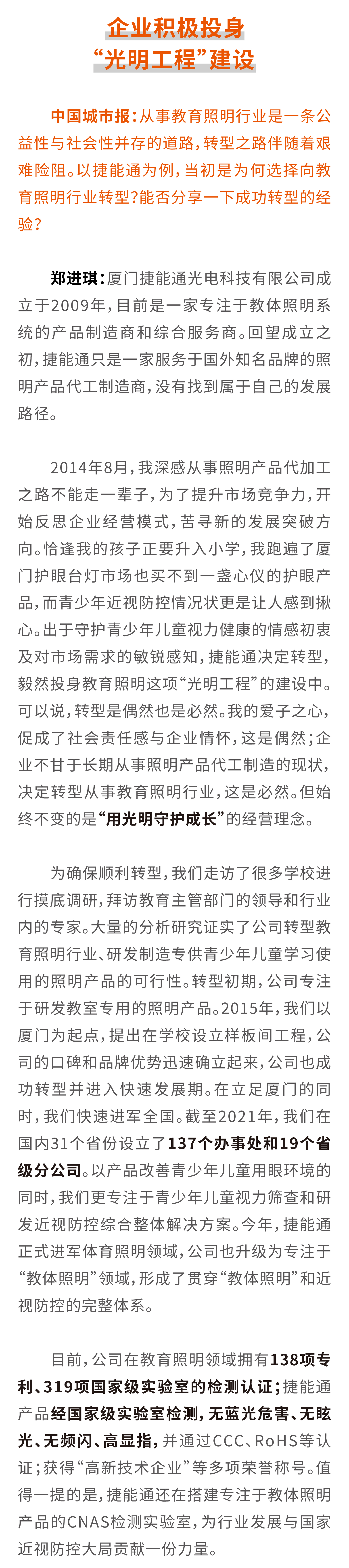 教育照明行業(yè)蓬勃發(fā)展中國城市報(bào):近年來,國家非常重視兒童青少年近視防控工作,出臺了一系列近視防控政策,引發(fā)行業(yè)和社會(huì)的廣泛關(guān)注。對此,您的看法如何?