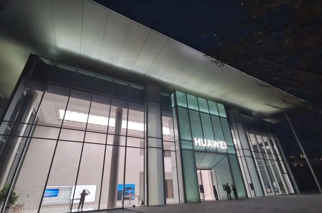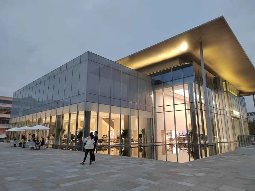 如2022年投入運營的華為基地G區旗艦展示店,通過全玻璃幕墻,配合建筑內明亮的燈光,讓整個外觀視覺更加通透高端,打造出一種極簡、科技、現代的建筑風格。