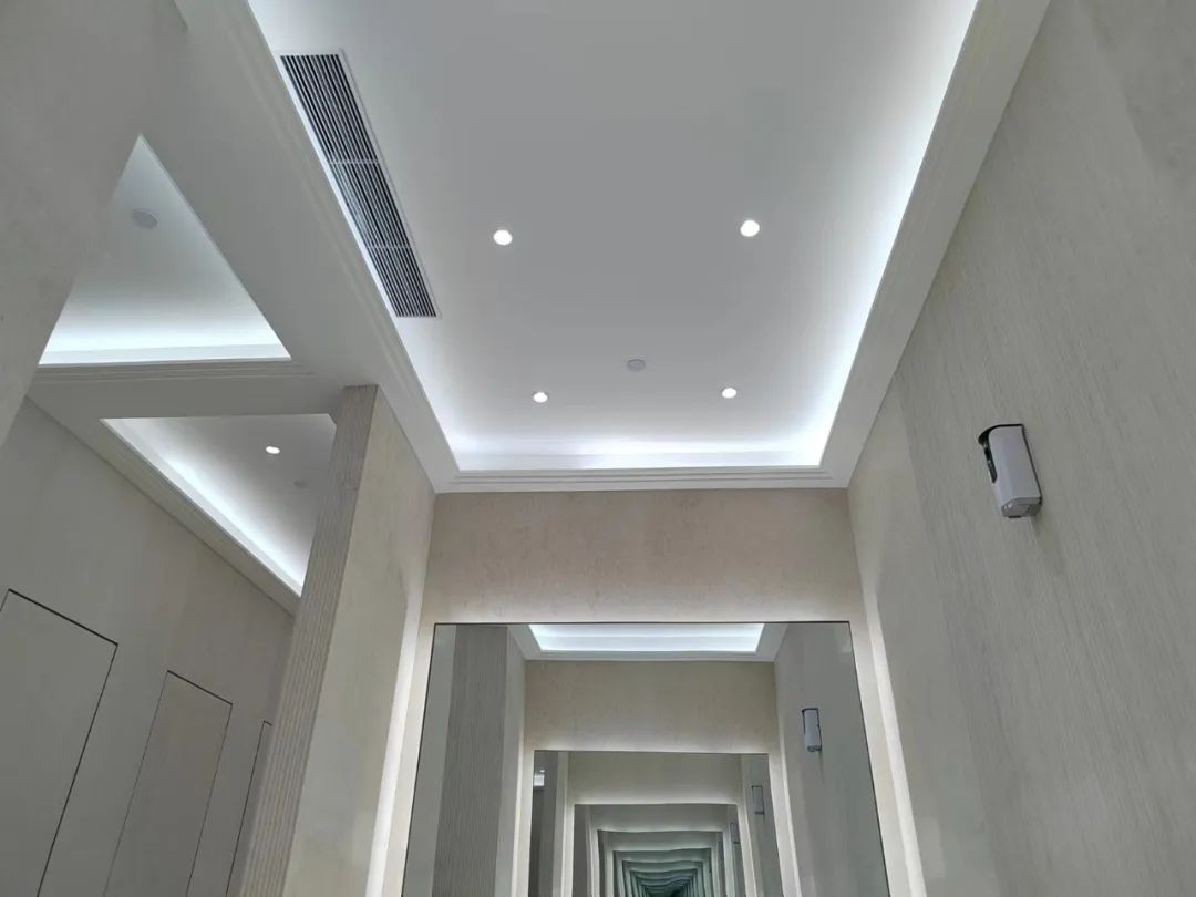 從活動大廳到產品展廳,長廊沿途圍繞,高聳的吊頂如宮殿華蓋,給予人宏偉的感受,卻又在點點星光、銀河般分布的燈光,色溫場景的變化中,營造出一種靈動與變化的科技感,讓人忍不住在建筑與燈光的交相輝映沉浸漫步。
