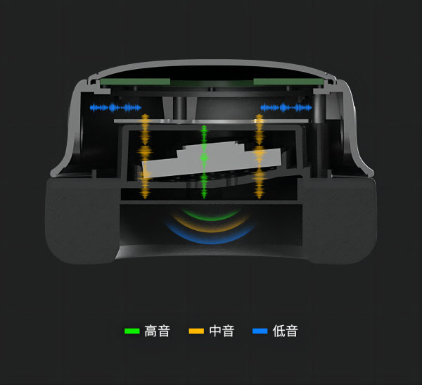 沉浸體驗的核心,減少失真、精準輸出。讓無線游戲耳機更專業,性能猛獸貼耳感受,物理雙音腔結構是VH800的強大核心,一個音腔負責傳播高頻與中頻聲音,另一個音腔只輸出低頻聲音,通過分離低音音頻,獨立調校輸出,避免了相互干擾,減少失真后音頻更清晰、通透。