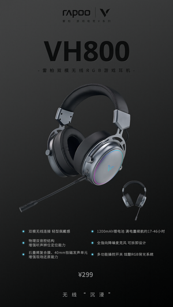 雙模無線連接、物理雙音腔結構、石墨烯材質,服從功能,不留于表面硬核開局。用沉浸式體驗為產品創新理念,無線游戲外設滿足不同場景需求,“靈活操控”、“娛樂生活”、“精準反饋”高度統一。雷柏無線游戲外設全家桶6件套,雷柏VH800雙模無線RGB游戲耳機,售價299元,現已上市!