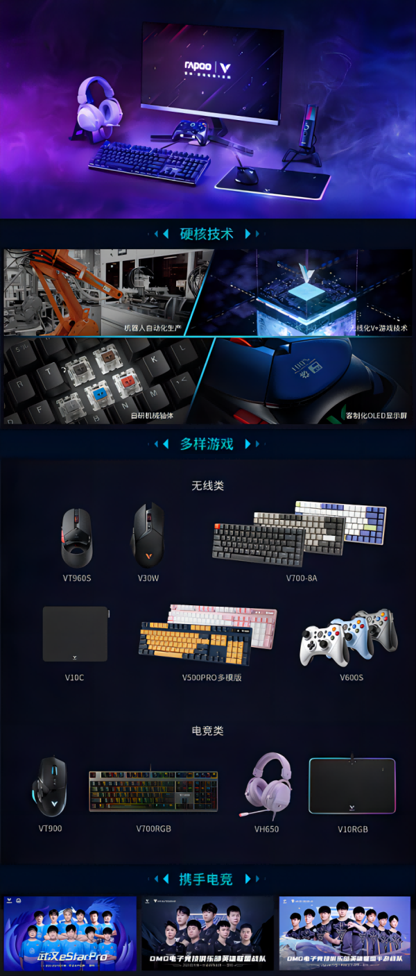 以技術研發為核心,以市場需求為指引,憑借雄厚的研發實力,自主研發定制雷柏軸體、雷柏微動、游戲芯片等核心產品部件。Qi無線充電、OLED顯示屏、防水防塵、板載內存、云端存儲等具有出色電競表現的個性化功能解決玩家需求痛點。V+無線游戲技術提升優化續航、低延遲、抗干擾、使用距離,以全新戰斗姿態探索電競未來。