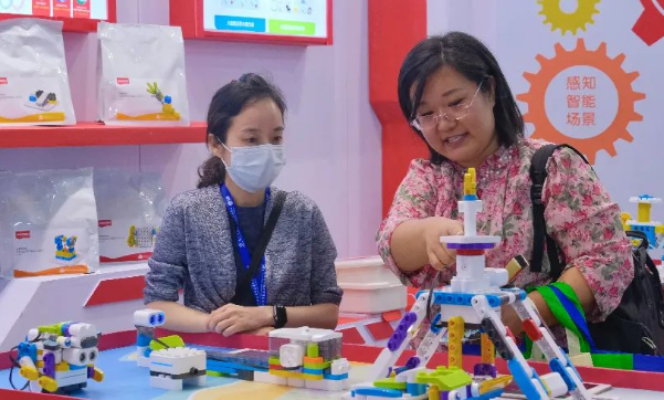 布魯可教育作為中國人工智能啟蒙教育領導品牌亮相展會,展示了1.5-9歲幼兒全齡段的人工智能啟蒙硬件、軟件等多樣產品,引發到場領導及觀眾極大的關注。