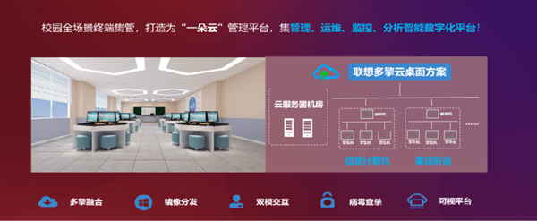 除了教學教研1+1方案外,針對校園內不同的教學需求,從降本增效角度出發,聯想多擎云桌面通過校園全場景終端的集中管控和分布式計算,實現教室的“一室百變”。同時,對于學校日常辦公、教學等場景,多擎云桌面也能夠提供更智能、更高效的一體化方案支持。