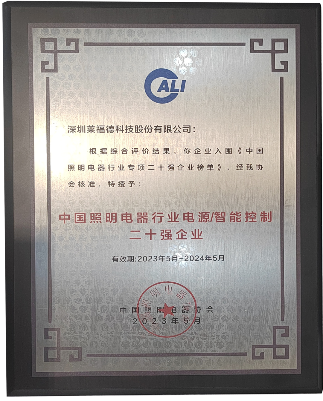 從企業整體實力、到萊福德品牌、再到細分領域;從技術研發創新,到細分產品落地,萊福德始終以專精的態度對待每一個市場,深入分析不同照明應用的痛點,讓每一款產品成為各自領域的“專家”,正是萊福德的這份專注,讓萊福德在智能控制領域再次脫穎而出,榮獲“電源/智能控制二十強企業稱號”!