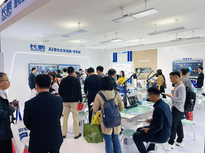 長(zhǎng)鵬展位分為AI教考練系統(tǒng)展示區(qū)、AI理化生實(shí)驗(yàn)教·考系統(tǒng)展示區(qū)、實(shí)訓(xùn)示教空間、實(shí)驗(yàn)裝備展示區(qū),吸引了眾多觀眾的駐足與關(guān)注。