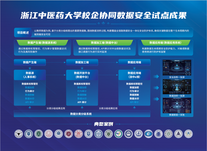 在浙江中醫藥大學校企協同數據安全試點項目中,美創科技基于分類分級梳理出的重要數據集,圍繞數據流轉過程,構建覆蓋全鏈路數據安全一體化安全防護體系,確保關鍵數據在整個生命周期內的端到端安全可控。