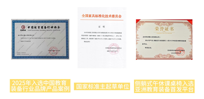 公司擁有一百五十多項課桌椅專利,其中課桌椅發明專利有十多項。公司榮獲“浙江省AAA級守合同重信用企業”,“人體工效學認證證書”等成就。公司是國家標準GB/T 46016-2025《中小學生午休課桌椅通用技術要求》主要起草單位,也是午休課桌椅團體標準起草單位。