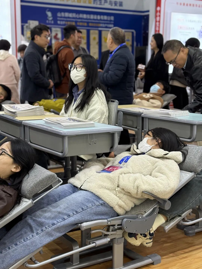 此次展會,師生之友向大家展示了符合國家標準GB/T46016-2025的優質午休課桌椅,尤其是本次展會新品側躺式午休課桌椅受到了眾多師生朋友們的一致好評,小學排距90cm,中學排距100cm就能實現后仰150度午休。課椅座面采用特制的PE藤制材料編織,透氣性好,還具備良好的承托彈性,久坐不易疲勞,提升睡眠質量。工作人員以專業的技術講解以及現場功能展示,向各位參展商展示了產品的亮點。